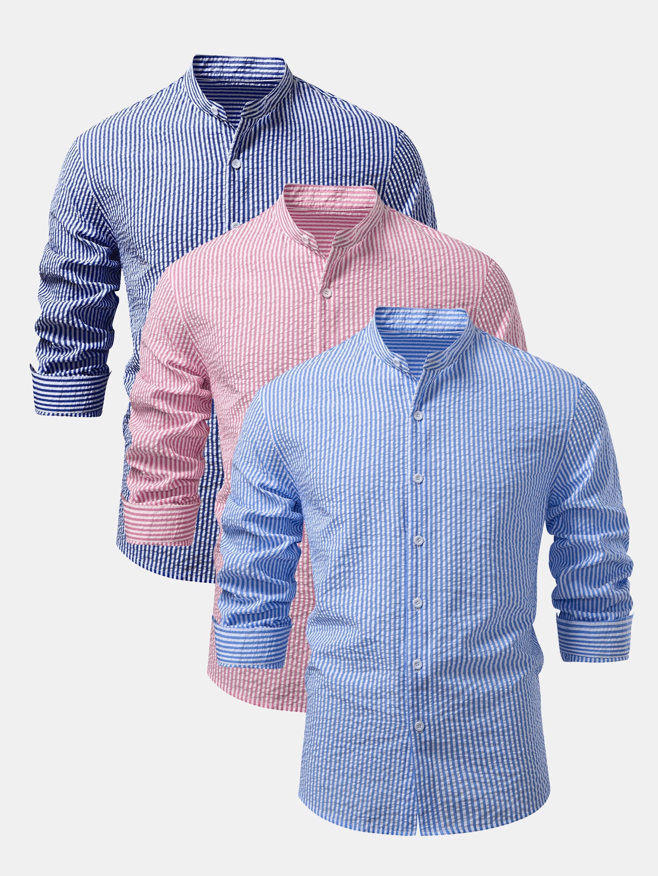 3 Pieces Seersucker Striped Stand Collar Shirt